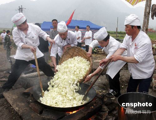 2008年5月25日下午6時,四川彭州市小魚洞鎮(zhèn)大南村田地上,來自北京的大廚們在為當(dāng)?shù)卮迕褡觥百c災(zāi)飯”。24日開始,北京美食聯(lián)盟組織北京全聚德、大鴨梨、便宜坊等大飯店的105名廚師,籌集200萬元資金在災(zāi)區(qū)分設(shè)3個賑災(zāi)點,免費為災(zāi)區(qū)群眾供應(yīng)飯菜。中新社發(fā) 張曉理 攝