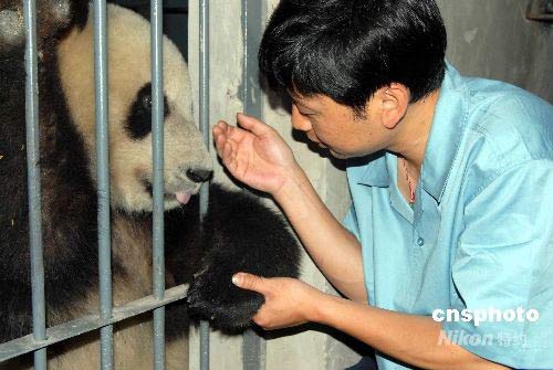 5月24日,來自四川臥龍的8只大熊貓平安抵達北京動物園,開始新的生活。此次進京的8只奧運大熊貓,是今年3月21日啟動的“2008四川臥龍大熊貓奧運北京行”投票評選活動中,由廣大網(wǎng)民從16只大熊貓里選出來的。這8只熊貓,雌雄各半,現(xiàn)在的年齡都在1歲9個月之間,屬亞成體,正是最活潑可愛的年華。臥龍飼養(yǎng)員在京對在地震中受驚嚇的熊貓美欣進行心理撫慰。中新社發(fā) 羅小韻 攝