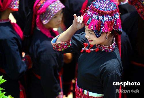 一位海南五指山苗族姑娘,5月下旬在村寨向游人展示民族服飾,宣傳民族文化。當(dāng)?shù)卣谕诰蛏贁?shù)民族傳統(tǒng)文化、利用原生態(tài)的自然環(huán)境條件,發(fā)展旅游業(yè),振興家鄉(xiāng)經(jīng)濟(jì)。中新社發(fā) 宋吉河 攝