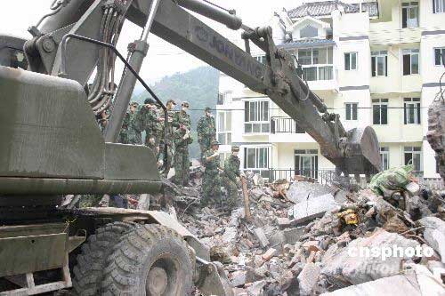5月28日,在四川汶川大地震重災(zāi)區(qū)之一的彭州龍門山鎮(zhèn),解放軍官兵正在緊張地清理廢墟。地震發(fā)生后,當(dāng)?shù)厮纻麘K重。中新社發(fā) 楊杰 攝