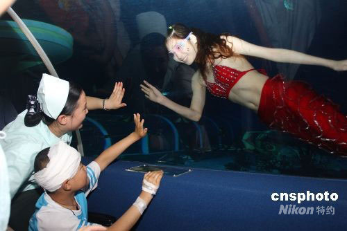 5月29日,重慶海底世界迎來了一批特殊的客人——來自四川地震災(zāi)區(qū)的6名小朋友。在武警重慶總隊(duì)醫(yī)院醫(yī)護(hù)人員陪同下,6名災(zāi)區(qū)小傷員參觀游覽了重慶海底世界,以這種特殊方式慶!傲弧眱和(jié)的到來。中新社發(fā) 賴熙平 攝