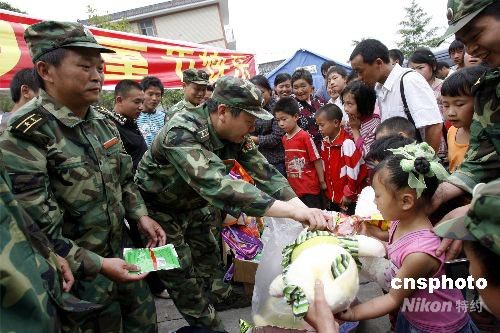 五月三十一日,四川省都江堰市紫坪鋪鎮(zhèn)望江村的孩子們收到了部隊贈送的兒童節(jié)禮物。四川預(yù)備役高射炮步兵師四團(tuán)負(fù)責(zé)都江堰市望江、黎明、白沙三個行政村的救災(zāi)工作。兒童節(jié)前夕,該團(tuán)為孩子們準(zhǔn)備了書包、玩具,送給當(dāng)?shù)氐暮⒆觽。中新社發(fā) 慎重 攝