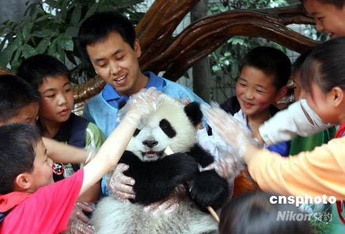 5月31日,成都市大熊貓繁育研究基地迎來了一群洋溢著快樂笑容的孩子,他們是彭州市龍門山鎮(zhèn)九年制學(xué)校的80名災(zāi)區(qū)學(xué)生。孩子們興致勃勃地參觀了熊貓基地并和熊貓寶寶星雅進(jìn)行了親密接觸。中新社發(fā) 黃榮 攝