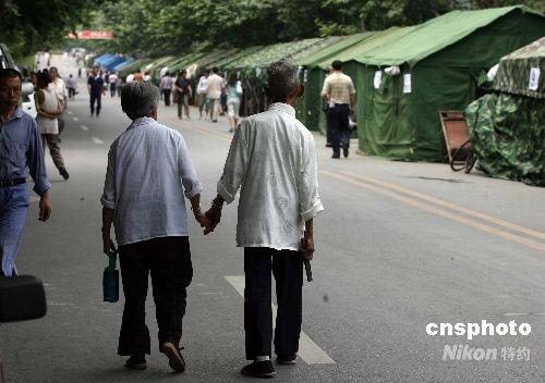 六月一日,唐家山堰塞湖避險(xiǎn)疏散預(yù)案三分之一潰壩方案涉及的下游群眾,已全部撤離到安全地帶。 一對年過古稀的老人牽手在綿陽市游仙區(qū)綿山路上新建的疏散安置點(diǎn)悠閑散步。中新社發(fā) 王瑤 攝