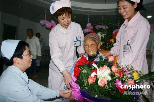 6月1日,四川北川縣災(zāi)區(qū)曲山鎮(zhèn)井夾山村99歲的杜銀珍老人在重慶市第二人民醫(yī)院十四病區(qū)醫(yī)務(wù)人員的精心打扮下,滿面笑容接受人們的百歲生日祝福。據(jù)了解,在5.12汶川大地震時(shí),杜銀珍老人背著重孫在廚房做飯,廚房垮塌后,強(qiáng)大的沖擊波將她一下推出5米多遠(yuǎn),摔到在院壩里。后在孫媳婦的攙扶下趕了10里山路才碰到救援部隊(duì),被送到綿陽市中醫(yī)院。5月19日轉(zhuǎn)至重慶市第二人民醫(yī)院接受治療。中新社發(fā) 陳仕川 攝