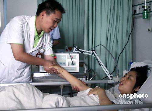6月2日,廣西醫(yī)科大學第一附屬醫(yī)院康復(fù)技師龍耀斌在給傷員郭昌碧做術(shù)后康復(fù)訓(xùn)練。據(jù)了解,該醫(yī)院對第一期55例四川地震傷員實施手術(shù)已全部完成,目前治療的重點開始向康復(fù)轉(zhuǎn)移,主要包括心理康復(fù)和肌體功能的康復(fù),已有心理醫(yī)生和理療師開始介入到康復(fù)治療當中。中新社發(fā) 林艷華 攝