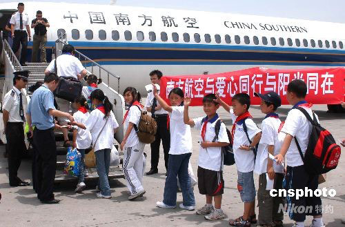 6月2日中午,成都雙流國(guó)際機(jī)場(chǎng),89名來(lái)自北川、彭州、寶興、崇州等地震災(zāi)區(qū)失去親人的兒童,乘坐南方航空海南分公司的愛(ài)心專機(jī)前往海南三亞,進(jìn)行為期半個(gè)月的“愛(ài)心呵護(hù)、陽(yáng)光行動(dòng)”心靈呵護(hù)之旅。他們中年齡最大的16歲,最小的8歲。中新社發(fā) 尹海明 攝