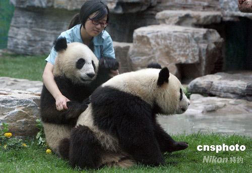 6月2日,一對(duì)雌雄“奧運(yùn)大熊貓寶寶”在北京動(dòng)物園新家依偎在一直照料它們的臥龍女飼養(yǎng)員身邊玩耍。5月24日從四川地震災(zāi)區(qū)運(yùn)抵北京的八只臥龍“奧運(yùn)大熊貓寶寶”,經(jīng)過(guò)多日的精心照料已基本從大地震的陰影中解脫出來(lái)。從6月5日開(kāi)始,公眾可以在這里盡情觀賞它們的風(fēng)采。 中新社發(fā) 任晨鳴 攝