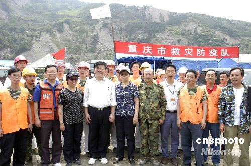 6月2日,中國(guó)衛(wèi)生部長(zhǎng)陳竺到映秀視察抗震救災(zāi)衛(wèi)生防疫工作,圖為陳竺在重慶衛(wèi)生防疫隊(duì)的駐地慰問衛(wèi)生防疫隊(duì)員。中新社發(fā) 肖邦忠 攝