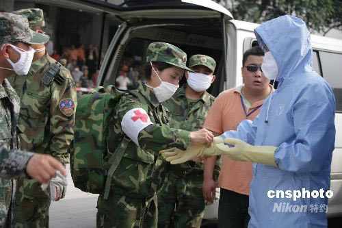 6月2日,在四川地震災區(qū)都江堰玉堂鎮(zhèn)房屋廢墟清理現(xiàn)場,一個穿著衛(wèi)生服的漂亮姑娘忙著為災民抱扎傷口,講解防疫知識,給官兵發(fā)放防護器具。這個忙碌的姑娘是濟南軍區(qū)總醫(yī)院護士張麗娜,6月2日是她預定的結婚日子。此時家中為了婚禮格外忙碌,而她卻依然在災區(qū)的廢墟上工作。圖為張麗娜在救災現(xiàn)場幫同事穿戴防護服。中新社發(fā) 仇成梁 攝