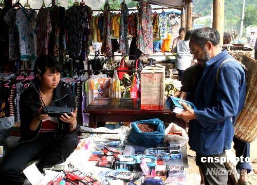 6月8日,濟(jì)南軍區(qū)某裝甲團(tuán)官兵在綿陽(yáng)市平武縣平通鎮(zhèn)設(shè)立了第一家農(nóng)村集貿(mào)市場(chǎng),幫助受災(zāi)群眾自力更生。這個(gè)市場(chǎng)占地300多平方米,有17個(gè)小攤營(yíng)業(yè),出售各種時(shí)令果蔬、肉類、衣服鞋襪以及收音機(jī)、手電筒等日用小家電。商品除了當(dāng)?shù)厣a(chǎn)外,主要從江油市采購(gòu),價(jià)格比地震前低10%左右。中新社發(fā) 畢華明 攝