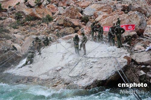 6月7日,經(jīng)過(guò)解放軍官兵和鐵路職工25個(gè)晝夜的連續(xù)奮戰(zhàn),寶成鐵路109隧道段嘉陵江堰塞湖被成功疏通,這標(biāo)志著預(yù)計(jì)在6月中旬疏通的109隧道和嘉陵江河道提前全部搶通。5月12日,四川汶川8級(jí)特大地震造成西安鐵路局管內(nèi)寶成線109隧道附近山體突然坍塌,連接西北和西南的交通大動(dòng)脈寶成鐵路中斷。約12萬(wàn)方巨石將隧道旁的嘉陵江河道完全堵塞,形成一條長(zhǎng)3.4公里、積水約100萬(wàn)立方米的堰塞湖,嚴(yán)重威脅到寶成鐵路和沿江人民群眾生命財(cái)產(chǎn)安全。目前,解放軍官兵和鐵路職工已清理出一條長(zhǎng)215米、寬25至50米、平均深度約5米的導(dǎo)流渠,基本達(dá)到迎夏度汛的要求。 中新社發(fā) 唐振江 攝