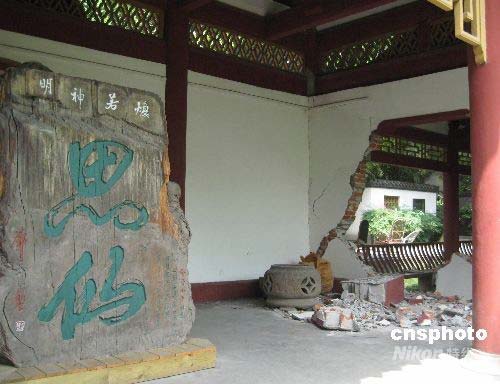 建于1982年的李白紀(jì)念館規(guī)模宏大、古樸典雅,藏有元、明、清李白著述版本80部、700冊,明清以及近代、當(dāng)代書畫珍品2738件,是中國李白紀(jì)念、研究中心,被譽為“詩的王國,藝術(shù)的殿堂”。在此次汶川大地震中,紀(jì)念館大部分建筑被毀。中新社發(fā) 肖青 攝