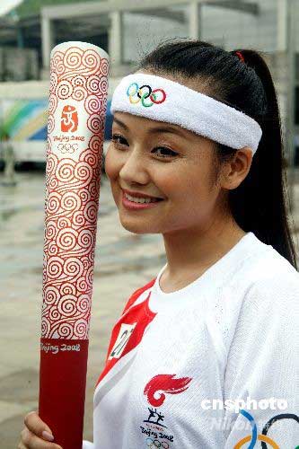 6月12日,著名苗族歌唱家阿幼朵跑完了第207棒奧運火炬?zhèn)鬟f后興奮地讓記者給她拍張紀(jì)念照。中新社發(fā) 彭年 攝
