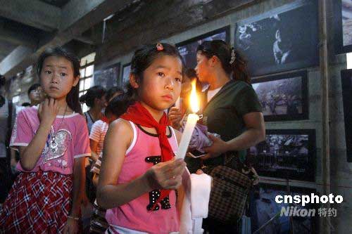 六月十二日,幾位孩子拿著蠟燭走進(jìn)四川成都的汶川大地震博物館。當(dāng)日,中國(guó)首家汶川大地震博物館在四川成都建成開(kāi)館,近4000件地震文物,1000余幅地震現(xiàn)場(chǎng)的照片,1000余幅地震死難者的照片墻持續(xù)震撼著觀展者的視覺(jué)。展覽以日記的形式,展現(xiàn)出從5月12日地震第一天到6月12日以來(lái),每天發(fā)生的大事件。中新社發(fā) 慎重 攝