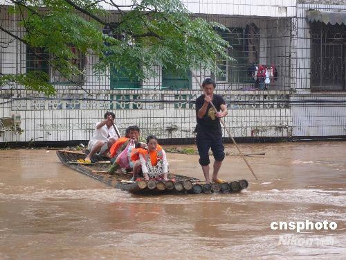 6月11日至13日凌晨,永福縣普降特大暴雨,降雨量高達(dá)346.3毫米,縣城東河和西河的洪水水勢兇猛,西河水最高達(dá)到143.45米,超過警戒水位5.45米。截止到13日10時許,永福全縣被洪水圍困民眾4900人,緊急轉(zhuǎn)移安置民眾4600多人。圖為救援人員正奮力轉(zhuǎn)移被洪水圍困的民眾。中新社發(fā) 周利朔 攝