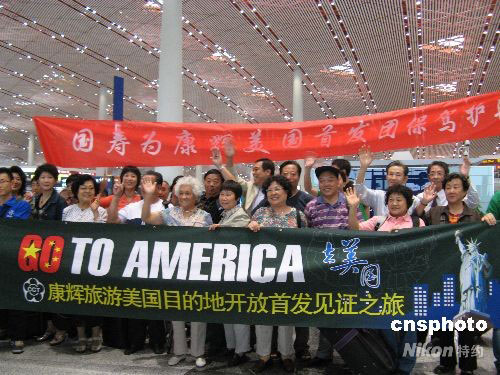 6月17日晚21點,北京康輝旅行社美國游首發(fā)團(tuán)游客71人從首都國際機場直飛洛杉磯,這也是迄今為止人數(shù)規(guī)模最多的赴美旅游團(tuán)。此次首發(fā)團(tuán)的行程為期12天,目的地涉及洛杉磯、圣地亞哥、布法羅、華盛頓、費城、紐約等美國東西海岸主要城市,參觀包括好萊塢環(huán)球影城、迪斯尼樂園、蓋蒂中心博物館等在內(nèi)的經(jīng)典景點。中新社發(fā) 張愛衡 攝