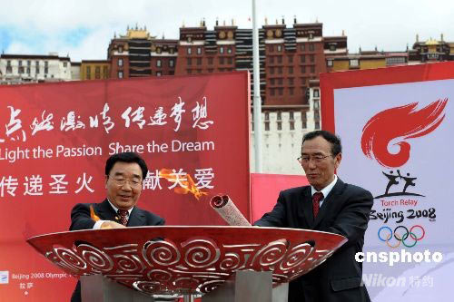 6月21日,奧運火炬在西藏拉薩進行傳遞。在傳遞終點布達拉宮廣場舉行的奧運史上首次熔火儀式上,中共西藏自治區(qū)黨委書記張慶黎與西藏自治區(qū)主席向巴平措,分別將由登頂珠峰的火種和在境內接力傳遞的火種點燃的兩支火炬,在圣火盆中相熔點燃。 中新社發(fā) 廖攀 攝