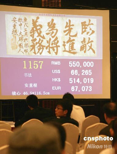 6月21日,中拍國際2008大型藝術(shù)品拍賣會在北京亞洲大酒店正式開拍,當天有609件書畫作品參加拍賣。其中一幅紙質(zhì)黃舊的書法作品——“臨敵先進,為將義務”吸引眾人的眼球,是當年刺殺伊藤博文的韓國民族英雄安重根在獄中的絕筆書,當場以55萬元人民幣的高價競拍成功。中新社發(fā) 趙雋 攝
