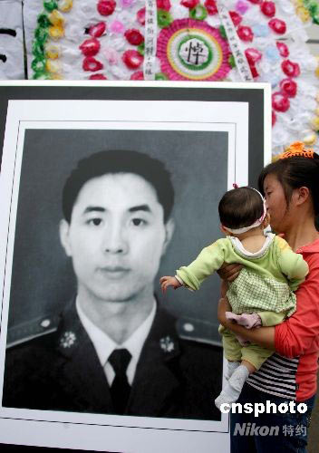 6月21日,在都江堰市胥家鎮(zhèn)抗震英雄武文斌烈士的靈堂前,各地群眾敬獻(xiàn)的花圈已達(dá)兩千余個(gè),數(shù)千民眾自發(fā)來到抗震英雄武文斌烈士的靈堂前進(jìn)行悼念。26歲的濟(jì)南軍區(qū)“鐵軍”部隊(duì)炮兵指揮連二期士官武文斌,因連日救災(zāi)勞累,于6月18日4時(shí)45分犧牲。6月21日,濟(jì)南軍區(qū)某集團(tuán)軍作出決定,為犧牲在抗震救災(zāi)第一線的某紅軍師實(shí)習(xí)士官學(xué)員武文斌追記一等功,并批準(zhǔn)為烈士。中新社發(fā) 曾憲平 攝