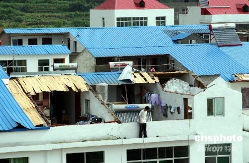 2008年7月7日晚,江西湖口縣部分地區(qū)遭遇龍卷風(fēng)襲擊,有一處兩間三層的新樓房屋頂被掀走。當(dāng)時,居民在家中熟睡,蓋在身上的被子也被大風(fēng)卷走,幸未造成人員傷亡。中新社發(fā) 張 俊 攝