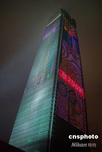 7月8日晚,“首都第一高樓”國貿三期大廈330米高的大樓外部的環(huán)保玻璃幕墻正在進行燈光調試。北京奧運會標志和主題口號璀璨奪目,幕墻上的燈光效果拼出各種圖案,成為北京新景觀。 中新社發(fā) 九州 攝