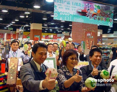 2008臺灣云林農特產品北京展銷及貿易洽談會7月17日舉辦。圖為云林縣長、云林農業(yè)合作社聯(lián)合社顧問蘇治芬(前排右二)與展銷團成員在某百貨公司為農特產品做促銷。中新社發(fā) 劉舒凌 攝