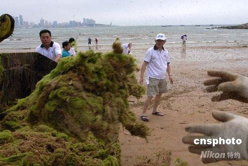 7月19日,青島第三海水浴場(chǎng),志愿者們正在清理殘余的滸苔。自5月下旬以來(lái),黃海中部海域出現(xiàn)大規(guī)模漂浮的滸苔,在青島市近海海域形成了大片聚集區(qū)。為了及時(shí)清除滸苔,努力將滸苔的不利影響降到最低,青島市近日出動(dòng)千余艘各類船只,穿梭在滸苔飄浮的海面,在海上進(jìn)行拉網(wǎng)式打撈。在大片的滸苔聚集區(qū),采用圍油欄攔截滸苔,使清除滸苔的的速度明顯提高,確保在規(guī)定的時(shí)間內(nèi)清除滸苔,為舉辦奧帆賽創(chuàng)造良好的海域環(huán)境。 中新社發(fā) 廖攀 攝
