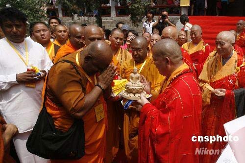 7月19日,斯里蘭卡高僧(左)贈(zèng)送阿羅漢舍利給少林寺方丈釋永信(右)。當(dāng)日,在少林寺舉行了少林慈云堂四面千手觀音菩薩圣像開(kāi)光法會(huì)。中國(guó)各大寺院長(zhǎng)老以及斯里蘭卡高僧參加了法會(huì)。中新社發(fā) 慎重 攝