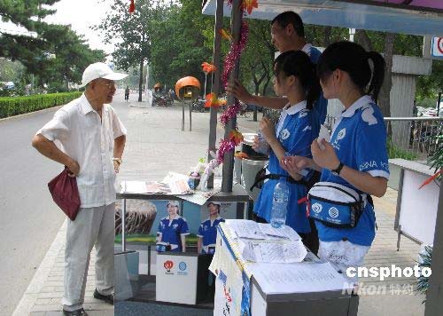 7月21日,以大學(xué)生為主體的奧運(yùn)志愿者們,在100多個(gè)由中國移動通信援助的“北京奧運(yùn)會志愿者服務(wù)站亭”中,為市民和中外游客解答奧運(yùn)比賽場館及交通服務(wù)知識。中新社發(fā) 鄒憲 攝