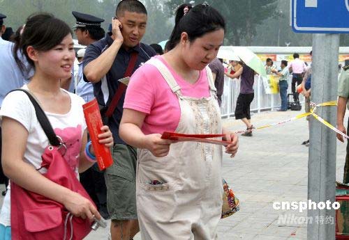 最后一批北京奧運(yùn)門(mén)票于25日正式開(kāi)始銷(xiāo)售,大批市民前來(lái)?yè)屬?gòu)門(mén)票。圖為一位孕婦在家人的陪同下不畏酷暑也來(lái)購(gòu)買(mǎi)奧運(yùn)門(mén)票。中新社發(fā) 葉林 攝