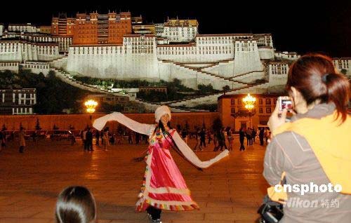 7月26日,游客在布達拉宮廣場上拍照留念。7月的拉薩綠樹成蔭,鮮花錦簇,在明媚的陽光下,來自世界各地的游客云集,拉薩又到旅游旺季,已經(jīng)走出“3.14”打砸搶燒暴力事件的陰影。據(jù)估計,7月份開放入境游,當月旅游人數(shù)將達到35萬人次。中新社發(fā) 周波 攝