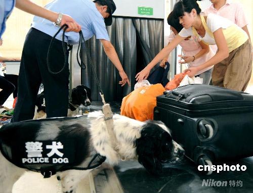 為確保二00八北京奧運(yùn)會(huì)青島奧帆賽的安全,青島火車站鐵路公安處引進(jìn)德國邢偵犬、比利時(shí)緝毒犬、英國搜爆犬等犬種,對(duì)客貨物品進(jìn)行嚴(yán)格檢查,在青島火車站廣場(chǎng)上巡邏盤查可疑人員。圖為旅客進(jìn)站物品通過安檢后搜爆犬再次把關(guān)。 中新社發(fā) 曲連遵 攝