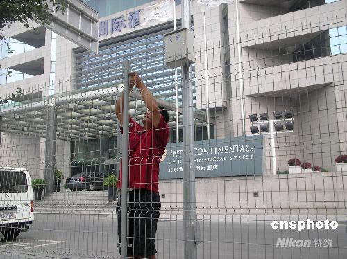 2008年7月27日下午,工作人員正在為美國(guó)籃球隊(duì)即將入駐的北京金融街洲際酒店架設(shè)防護(hù)鐵絲網(wǎng)。 中新社發(fā) 賴松 攝