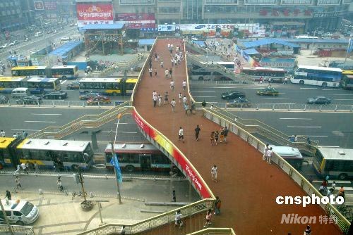 近日,北京市目前最寬的人行過街天橋在中關(guān)村核心商圈建成并正式投入使用,到中國高新電子產(chǎn)品集散地——中關(guān)村選購物品的顧客今后不必再穿行車水馬龍的中關(guān)村大街。人行過街天橋的建成將有效解決中關(guān)村地區(qū)人車混行、交通擁堵和行人過街不便的狀況,緩解當(dāng)?shù)亟煌▔毫。中新社發(fā) 富田 攝
