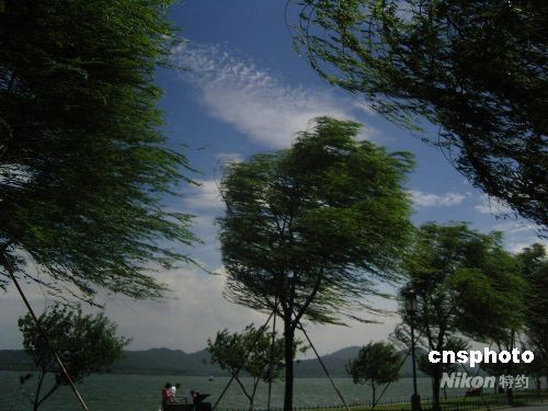 7月28日,山雨欲來(lái)風(fēng)滿(mǎn)樓,受今年八號(hào)臺(tái)風(fēng)“鳳凰”的影響,往日寧?kù)o的杭州西子湖畔狂風(fēng)大作,白堤上的柳樹(shù)“狂舞”不斷。中新社發(fā) 柴燕菲 攝