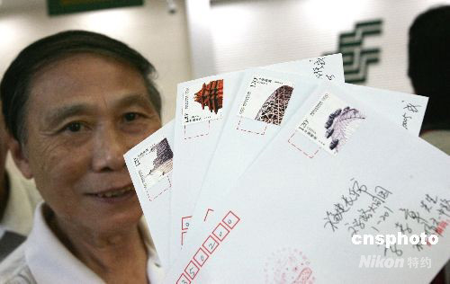八月二十四日上午,北京奧運(yùn)會(huì)最后一天,一位老伯在福州市郵電大樓高興地拿著剛買到的《奧運(yùn)會(huì)從北京到倫敦》紀(jì)念郵票!秺W運(yùn)會(huì)從北京到倫敦》紀(jì)念郵票,由中國(guó)國(guó)家郵政局和英國(guó)郵政聯(lián)合發(fā)行。 中新社發(fā) 楊婀娜 攝