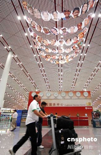 8月26日,北京首都機場三號航站樓內“笑臉”懸掛,缶樂齊鳴,一片歡樂的海洋,歡送奧運大家庭成員回國。 中新社發(fā) 吳芒子 攝