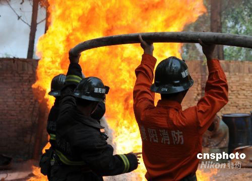 8月28日,河南濮陽市疙瘩廟村一家地下非法小煉油作坊在廢油加工時,操作不慎引發(fā)火災。大火炙烤著現(xiàn)場10多個裝滿易燃品的原料罐,并威脅著周圍群眾的生命財產(chǎn)安全。濮陽市消防支隊華龍區(qū)大隊官兵接報后,迅速趕到現(xiàn)場,經(jīng)過1小時激戰(zhàn),終將大火撲滅。中新社發(fā) 劉敬寬 攝