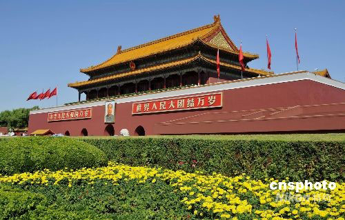 9月1日,北京奧運(yùn)會(huì)后,天安門(mén)城樓重新粉刷裝飾一新,在藍(lán)天鮮花的陪襯下,更顯雄偉壯觀,迎接殘奧會(huì)即將到來(lái)。中新社發(fā) 王宇婷 攝