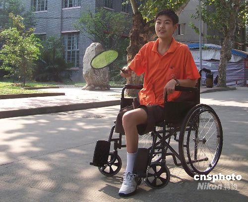9月5日,受中國殘疾人聯(lián)合會邀請,在四川汶川大地震中受傷的四位少年赴北京參加殘奧會開幕式。圖為4日下午,在華西醫(yī)院地震傷員康復中心,來自北川中學的十七歲少年王飛正在打羽毛球。中新社發(fā) 伊西科 攝