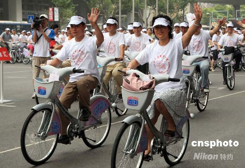 9月12日,上海誕生首個禮儀單車隊(duì),600名“迎世博文明禮儀宣傳員”以自行車為綠色出行工具,帶頭遵守文明規(guī)范,示范文明禮儀。中新社發(fā) 潘索菲 攝