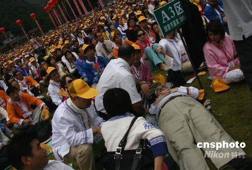 9月12日上午,2008年中國湖南國際旅游節(jié)在張家界國家森林公園開幕,湖南借助國際旅游節(jié)這一機遇向世界展示自身獨特的旅游資源和旅游產(chǎn)業(yè)發(fā)展?fàn)顩r。500余名境內(nèi)外旅行商和媒體記者受邀觀看開幕式表演,一位胖老外坐著看覺得不舒服,直接躺在草地上,引起了一場小誤會。中新社發(fā) 張家根 攝