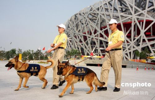 2008年9月17日,北京殘奧會閉幕式即將開始,警方工作人員牽著多條防爆犬對“鳥巢”進(jìn)行地毯式檢查,保障殘奧會順利閉幕。中新社發(fā) 吳芒子 攝