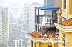 32樓的高空竟搭建起一個(gè)近20平米的陽臺(tái)(如圖)。除了驚嘆,網(wǎng)友們戲稱之為“重慶最牛陽臺(tái)”、“重慶第九奇跡建筑”。