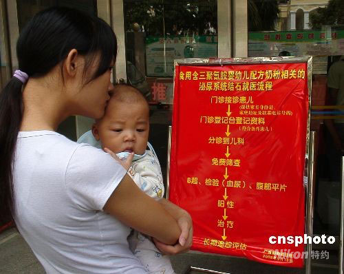 9月19日,廣西婦幼保健院門診樓前,一位母親準(zhǔn)備帶小孩篩查腎結(jié)石。問題奶粉事件在中國(guó)各地引起家長(zhǎng)們的普遍擔(dān)憂,廣西諸多醫(yī)院紛紛開設(shè)“綠色通道”等便民措施。中新社發(fā) 王剛 攝