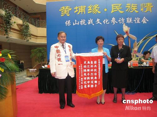 圖為臺(tái)灣中華新黨主席樂可銘(左一)向云南省黃埔軍校同學(xué)會(huì)秘書長(zhǎng)李俊平(左二)贈(zèng)送錦旗。