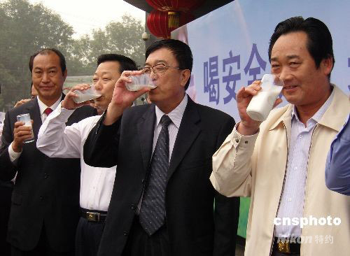 9月25日,在石家莊市最繁華的先天下購(gòu)物廣場(chǎng),該市副市長(zhǎng)張殿奎(右二)帶頭將滿滿一大杯某品牌純牛奶一飲而盡,隨行的石家莊市工商局、質(zhì)量技術(shù)監(jiān)督局、商務(wù)局等相關(guān)部門負(fù)責(zé)人也紛紛效仿,將手中品牌各異的滿杯純牛奶全部喝下,以消除此間民眾因三鹿問(wèn)題奶粉事件而產(chǎn)生的顧慮。