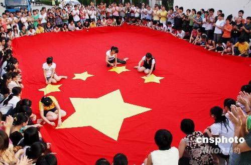 9月27日下午,隸屬于江西省上饒經(jīng)濟(jì)開(kāi)發(fā)區(qū)的臺(tái)資企業(yè)江西宏福服裝公司廠區(qū)內(nèi),幾百名縫紉女工匯集一起,共同縫制了一幅長(zhǎng)10米、寬7米的巨型五星紅旗,并以此來(lái)慶祝祖國(guó)59華誕和神七順利飛天,表達(dá)出他們熱愛(ài)祖國(guó)的心情。中新社發(fā) 卓忠偉 攝