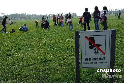 9月29日,北京奧林匹克森林公園露天劇場(chǎng)大草坪被迫準(zhǔn)許游人進(jìn)入休閑,草坪大面積遭到踐踏。北京殘奧會(huì)閉幕后,該草坪在禁止游人進(jìn)入時(shí),一直有游客違規(guī)強(qiáng)行進(jìn)入,并不斷與保安人員發(fā)生沖突。鑒于近期警員、保安、志愿者紛紛休假離去,森林公園管理機(jī)構(gòu)正式撤除了草坪阻攔線,默許游人在此行走,滯留。中新社發(fā) 鄒憲 攝